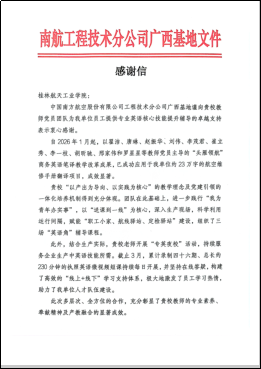 为此,中国南方航空股份有限公司工程技术分公司广西基地发来感谢信,感谢团队以专业知识持续赋能公司成长。该活动获《中国网》《新华网》《中国日报网》《环球网》等专题报道,充分凸显了校企党建联建社会服务的实效。